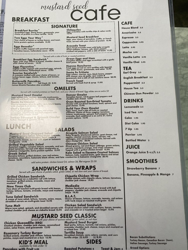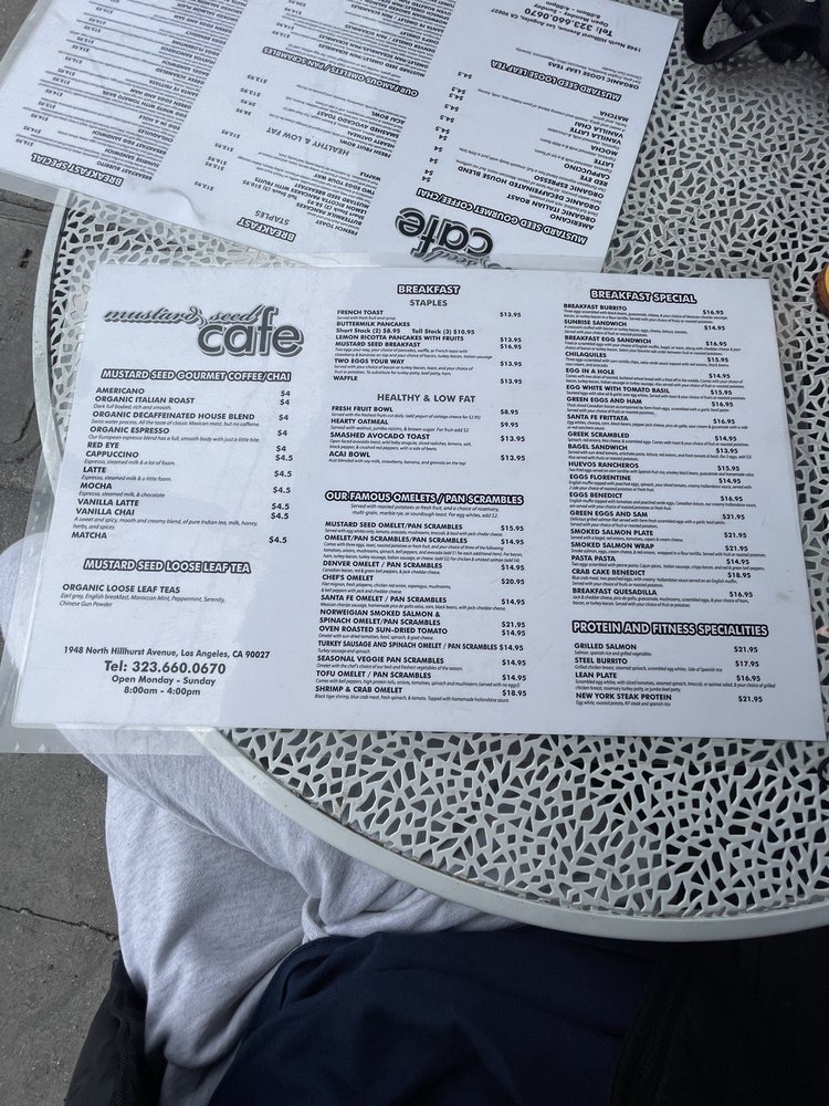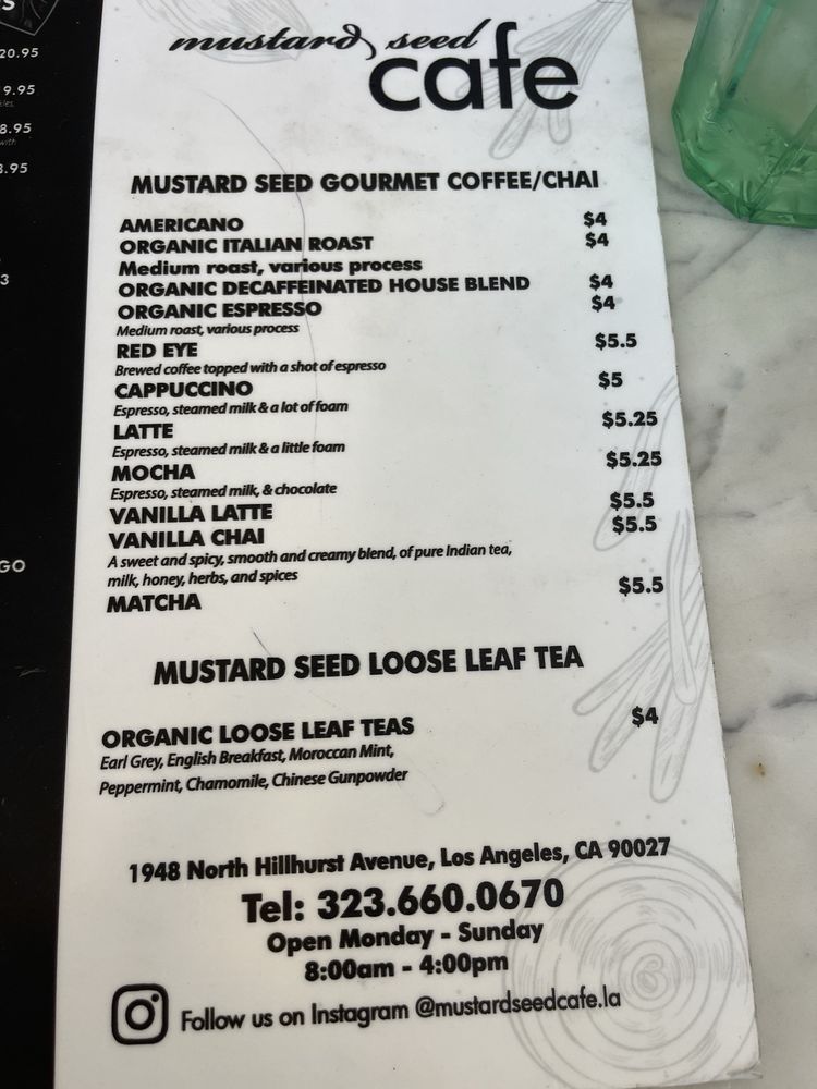 Mustard Seed Café, located in Los Angeles, offers a diverse menu with options for everyone. From traditional breakfast staples like French Toast and Pancakes, to healthy choices like Fresh Fruit Bowls and Acai Bowls, there is something for every palate. Their Breakfast Specials, like the Breakfast Burrito and Chilaquiles, showcase a fusion of flavors that will leave you satisfied. Customers rave about the Lemon Ricotta Pancakes and Chipotle Chicken Wrap, praising the generous portions and reasonable prices. The cozy ambiance and attentive service add to the overall dining experience. Whether you're a regular or a first-time visitor, Mustard Seed Café is a must-try destination for a delicious and fulfilling meal.