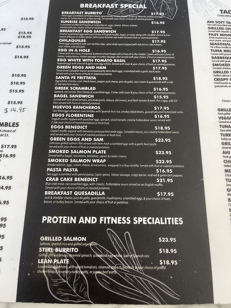 Egg whites, chorizo, corn, black beans, pepper jack cheese, pico de gallo, sour cream, and guacamole with a side of red ranchero sauce.